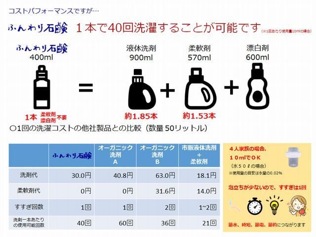 当商品は、市販の液体洗剤と比べ約1/3の使用量でお洗濯ができます。言い換えれば、市販の液体洗剤より3倍長く使うことができます。さらに、今までお洗濯時に一緒に使っていた柔軟剤や漂白剤、蛍光増白剤は一切必要ありません。むしろ『使わないでください』なぜなら、当商品は繊維本来の柔軟性を復活させるため、強制的に柔らかくする柔軟剤は必要ないのです。まして漂白剤などは無駄に化学物質を染み込ませるだけなので入れないでください。そして最後に、使用量が少ないため『すすぎも1回』で十分です。水道代も節約できますね。
